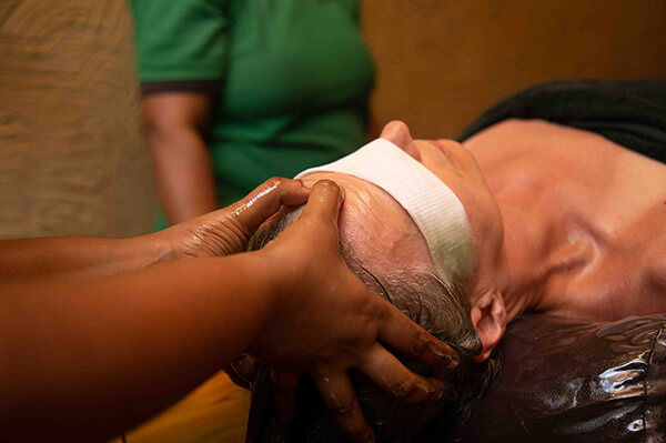 This is a traditional Ayurvedic head therapy using specific herbal oils with specialized gentle deep strokes and pressure on various marma points.